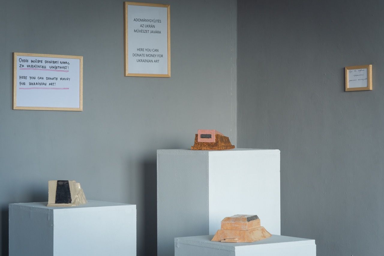 The Empty Pedestals by Maksym Khodak refer to the so-called “tank monuments”, installed by the Soviets in Ukraine to commemorate the victory in World War II. In small sculptural objects, the artist reproduces the pedestals of these memorials, referring to the ones located in the cities that were granted the hero city status in 2022 by the Ukrainian President Volodymyr Zelenskyi. Just like in the post-War tradition of the second half of the 20th century, this gesture aimed to celebrate the citizens’ heroism, devotion and the collective bravery in their defense against the aggressor. All sculptures in the series also function as piggy banks: each was used for its intended purpose during the exhibitions in Europe and Ukraine. Visitors are invited to make a donation for the needs of Ukrainian art. The call to donate is written and designed by the hosting institution. With this gesture, the artist questions the role of art during the war and the way cultural institutions change their strategies in times of crisis. The donations collected during the exhibitions will remain inside the objects forever. Yet, the proceeds from the sale of the works are distributed among organizations that help the Armed Forces of Ukraine.